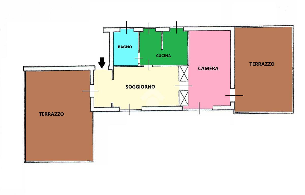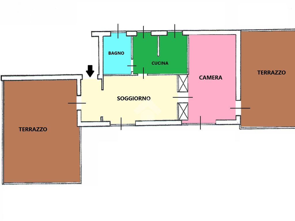 E' composto da un soggiorno, cucina con tinello, camera matrimoniale, un bagno e due ampi terrazzi abitabili uno in zona giorno e l'altro in zona notte.